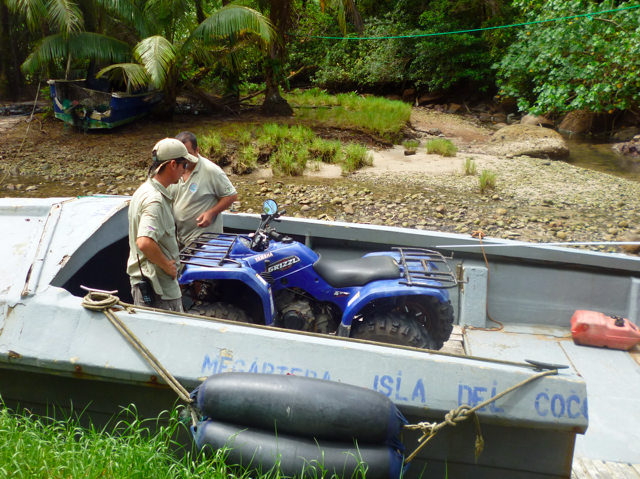 This four wheeler is being shipped back to the mainland for repairs because the shaft that drives the rear axle has snapped. It was lifted on board Megaptera by four funcionarios. It will be transferred to one of the diving boats by crane and carried back to Costa Rica.