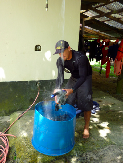 Even though he worked through lunch and is eager for some chow, Bryan takes the time to rinse off the snorkel gear in fresh water after spending the morning cleaning the hull of the Mobula (One of the island’s transport launches).